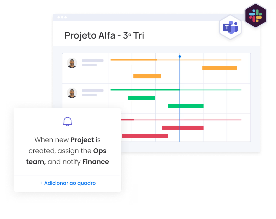 - Integração com ferramentas corporativas: O Work Management se conecta facilmente com sistemas como Slack, Microsoft Teams, Google Drive, CRMs e ERPs, criando um ecossistema conectado que elimina silos de informação.